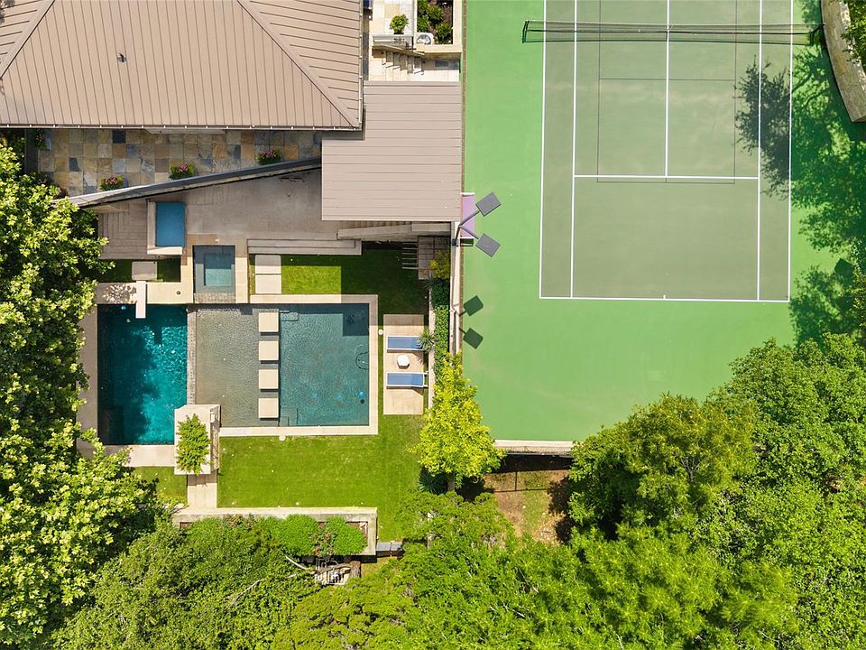 Elevated and exceptional! Tucked within the prestigious Westview community on a double cul de sac lot, this Hill Country Contemporary estate was masterfully designed by architect James LaRue, AIA. This award-winning residence seamlessly blends timeless architecture and modern luxury. Crafted with a refined palette of native Central Texas materials, including fossil limestone, Lueders stone, slate, travertine, and rich hardwoods—feeling organically connected to the land. Expansive interiors with soaring 10 to 20-foot ceilings and dramatic walls of glass flood the home with light from multiple exposures, reinforcing a seamless connection between indoor and outdoor living. Well sited on a tree-filled 1.37-acre double lot, the estate was designed to preserve heritage oaks while incorporating a sprawling yard and exceptional outdoor amenities, including a lighted full-size tennis court and resort-style pool. The court has also served as a play space for children, a gathering hub, and the ultimate lawn party setting. The expansive kitchen was designed for large-scale entertaining, offering multiple islands and prep stations, dual ovens and dishwashers, an 8-burner Wolf cooktop, built-in microwave, and an oversized walk-through pantry. The mahogany-clad office/study provides a luxurious work-from-home setting. The primary suite and secondary bedrooms have recently undergone an extensive renovation, providing sophisticated finishes throughout. Five interior fireplaces provide ambiance, while a sixth fireplace anchors the outdoor living, complete with built-in grill, TV, and seating. Additional highlights include two laundry areas, four-car garage + circular drive, expansive lush lawn and landscape lighting. Just 12 minutes to Downtown Austin and within award winning Eanes ISD, this cherished neighborhood offers a unique walkability and sense of community. This property has relaxed into its setting with such grace—a living testament to fine architectural vision.