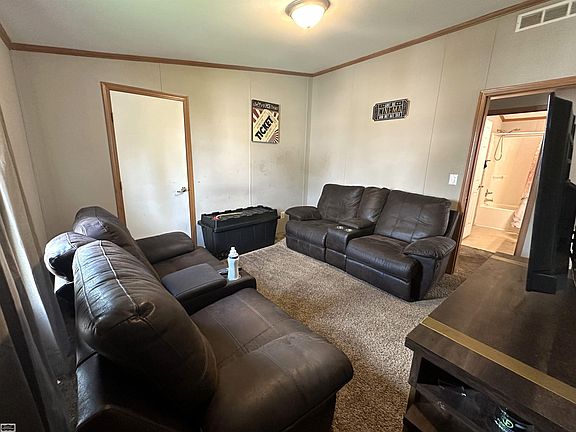 Lovely 4 bedroom, 2 bathroom double-wide mobile home located in River's Edge Community. Featuring 2 in-ground swimming pools, clubhouse, playground, and Chippewa Valley Schools. Backyard space has a shed and there are 2 parking spaces in front of home. Large kitchen and dining space directly off of family room, creating a nice open layout. Laundry room with back door adds to convenience of home. The master suite is located at one end of home and other three bedrooms at the opposite end. Home is in need of a few small repairs and is priced accordingly - roof leak caused some ceiling damage by the laundry room and master bathroom, and the flooring in both bathrooms needs some replacement boards.