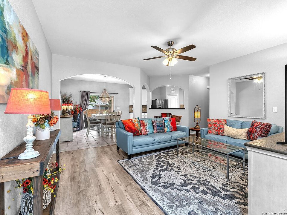 Welcome to this well maintained 3 bedroom, 2.5 bath townhome located in the gated Villas of Silverado Hills on San Antonio's highly desirable North Side. Nestled in a quiet cul-de-sac, this move in ready home features high grade vinyl flooring, modern window treatments, and elegant crystal light fixtures throughout. Inside, you'll love the open concept layout with spacious living and dining areas ideal for both everyday living and entertaining. The kitchen comes fully equipped, and the sale includes the refrigerator, patio furniture, front pottery, and plants, making your move in process seamless. Enjoy convenient access to Loop 1604, Hwy 281, and Bulverde Road, with top rated schools, shopping, dining, and major city attractions like the River Walk, Pearl District, Hemisfair Park, and the San Antonio Zoo just minutes away.