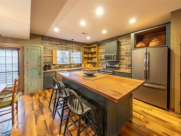 The open-concept main level features a spacious living room with a gas fireplace and custom wood reclaimed wall and mantel, seamlessly flowing into the dining area and designer kitchen complete with a large butcher block island, Corian counters, custom cabinetry, recessed lighting, and a commercial-grade backsplash that resembles weathered wood. French doors open to a balcony porch—the perfect spot to relax outdoors or enjoy your morning coffee.