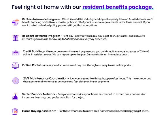 At Chesson Property Management, we strive to provide an experience that is cost-effective and convenient. That's why we provide a Resident Benefits Package (RBP) to address common headaches for our renters. Our program handles insurance, credit building and more at a rate of $22.00/month, automatically added to every eligible property with the ability to opt-out. More details upon application.