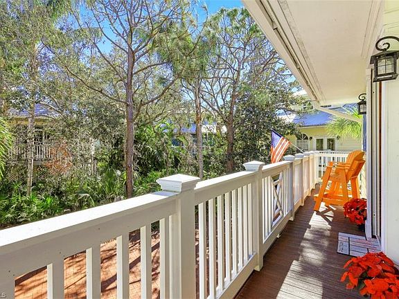 This spacious key west style home offers three levels of fabulous living! The interior space features custom woodwork, coffered beadboard ceiling in dining/living rooms, plantation shutters, and wall finishes throughout. The primary bedroom suite is located on the top floor and offers total privacy, features hardwood floors, wainscoting walls, a beautifully designed bath, his/hers closets, and a private sitting deck. Flooring includes travertine, wood, and tile. Guest bedrooms on the second floor share a fabulous, redesigned guest bathroom with an added powder room. The first level offers an air-conditioned two-car garage that can accommodate 4 cars, and/or boat storage, along with a workshop, and storage room. Guests will enjoy their very own private quarters located on the first level with a separate entrance. The kitchen boasts Bosch stainless steel appliances, an oversized fridge, quartz countertops, pantry, and opens to dining/living rooms for easy entertaining. Escape to the peaceful screened-in lanai, and enjoy the nature sounds and beautiful wildlife. A tranquil ambiance prevails throughout the backyard surrounded by lush landscaping in a private setting! See remarks!