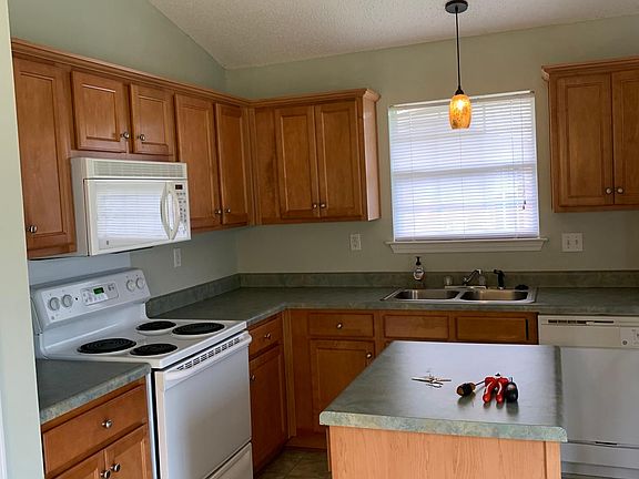 Split floor plan with a large master and walk-in closet. Kitchen appliances include microwave, electric stove, and refrigerator. Other features include a kitchen island, fenced in back yard, garage, central heat and air.
