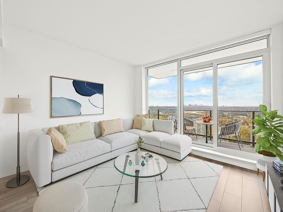 Floor-to-ceiling windowsSpacious covered balconySleek kitchenIntegrated bosch appliancesGas cooktopQuartz countertopsFunctional island