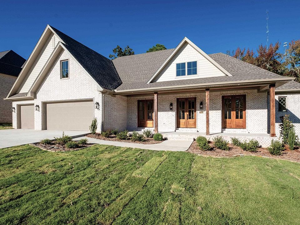 Newly constructed feature rich home backs up to the Bear Den Wild Life Preserve. The 4268 SF 4 bed/4.5 bath home is located on a level lot with 3 bedrooms on the main level. Office is directly off the main entry with 2 sets of French doors. The large primary suite offers spa-like bathroom, make-up vanity, full length mirror, soaker tub, walk-in shower, & linen closet. The adjoining closet has laundry room access providing extensive storage and wall mounted ironing board. The kitchen offers abundant cabinets, a large island with quartzite top, 6-burner gas stovetop, double oven, microwave, & walk-in pantry. The adjacent dining room has a built-in buffet with Tudor style glass doors & matching quartzite top. The gas log fireplace in the living room is trimmed in fluted tile and surrounded by built-ins. Upstairs find a bedroom, bath, craft room, lounge and large flex space. Outdoors provides an ideal place to entertain and enjoy nature on the private covered porch with fireplace. Three car garage, copious storage, high efficiency systems, hardwood floors through most of the home complete this traditionally styled residence. Enjoy miles of private walking/bike trails in Bear Den.