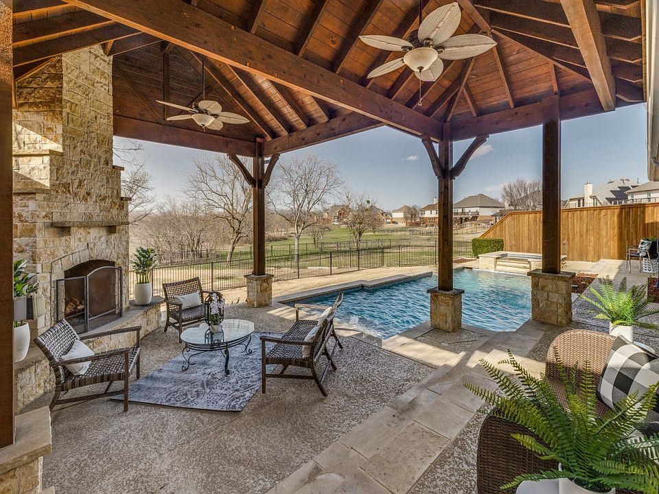 Luxurious Oasis in The Colony: Nestled on a serene cul-de-sac, this exquisite property boasts 5 bedrooms, 3.5 baths, and a 3-car garage, perfectly designed for sophisticated living. Set on a .32-acre lakefront lot, enjoy breathtaking sunsets from the inviting pool or dual-level patio, complete with a stunning majestic stone fireplace and cedar covering