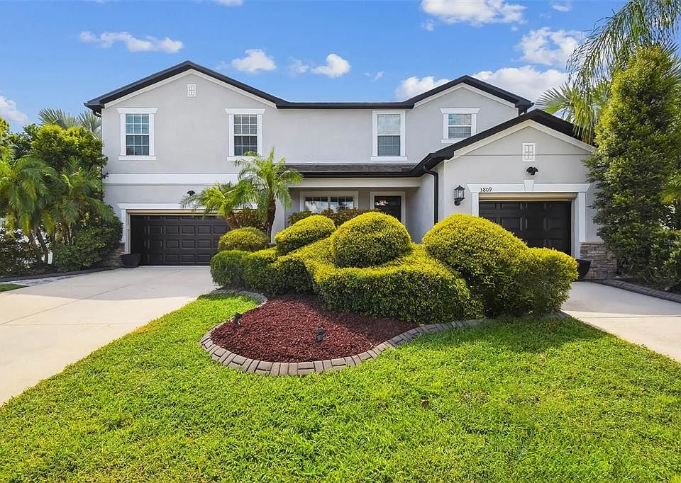 Located in the highly sought-after, A-rated Sunlake School District, this exceptional Washington model by Lennar offers nearly 4,000 sq ft of thoughtfully designed and fully livable space, including converted garage flex areas—featuring 4 true bedrooms (each with its own ensuite bathroom), 4.5 total baths, an upstairs loft, and a commercial-grade media room—all designed for luxury, comfort, and flexibility. Two split garages have been finished as livable flex spaces with 2022 mini-split ACs, insulated doors, smart locks, roll-down Phantom screens, upgraded lighting, and weatherproof flooring, but can easily be used again as traditional garage space, storage, a gym, office, or additional living area. Triple sliders lead to a vaulted 1,000 sq ft screened lanai with ceiling fans, quad outlets, and dedicated hot tub wiring, all surrounded by mature landscaping, decorative concrete walkways, and a fenced backyard with firepit seating and smart irrigation. Rich custom millwork, crown molding throughout, two French pocket doors, and dramatic wood-paneled feature walls set the tone, while the formal living and dining rooms offer a classic touch just off the entry. The gourmet kitchen is equipped with granite countertops, solid wood 36" upper cabinets, 2022 stainless steel appliances, a kitchen island, and a sunlit breakfast nook—and it overlooks the expansive family room with soaring ceilings, recessed lighting, and a Twin Star ceiling fan. The downstairs bedroom includes an ensuite bath and exterior access to the lanai—ideal for guests or multi-generational living. Upstairs, the expansive primary suite features two custom walk-in closets, a soaking tub connected to a glass and metal-framed shower, dual granite vanities, and a large linen closet for added storage and convenience. The additional bedrooms upstairs also include ensuite baths, ceiling fans, and are generously sized to provide comfort and privacy for family or guests. A versatile loft offers extra space for a gym, office, or playroom, and the professionally built media room includes a raised floor, Sony 4K projector, 130” screen, Bose 7.2 surround sound, and six reclining cinema chairs—formerly two bedrooms and easily converted back. Major upgrades include two new high-efficiency central AC systems (2022) with UV pathogen defense, solar hybrid water heater (2025), whole-house generator with dual propane tanks, surge protection, iron and heavy metal filtration system, water softener, recessed LED lighting, newer appliances, French drains, and full exterior paint (2025). Exterior enhancements include new dual sliders, smart-entry doors, and 8 HD security cameras with smart automation. Located in Wellington, a premier subdivision of Concord Station, this home is directly across from the amenity center and clubhouse. Concord Station offers resort-style amenities including a community pool with splash pad, clubhouse, fitness center, tennis and basketball courts, and playgrounds. Enjoy a private, upscale lifestyle with key destinations just minutes away: Publix at The Shoppes at Sunlake Centre, Sunlake High School, and Imagine School K–8 (3 mins), EOS Fitness, Chick-fil-A, Aldi, and Fresh Kitchen (5 mins), AdventHealth ER and Veterans Expressway (8 mins), TPC Tampa Bay (12 mins), Tampa Premium Outlets (15 mins), USF (22 mins), Tampa International Airport (25 mins), and Downtown Tampa (26 mins). Don’t wait—schedule your private showing today!