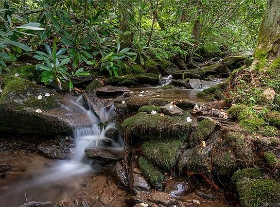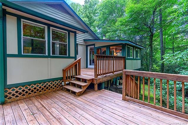 Bold Creek.. One level home and rental apartment below.. Setting offers huge amount of privacy close to Maggie Valley on state maintained paved road. Garage on main level for wheelchair access. Wood, tile and carpet floors.. Vaulted ceiling in great room with stone fireplace (gas).. Master suite has walk-in tub and large whirlpool tub.. Outdoor living areas are fabulous with Spacious vaulted covered porch overlooking the stream and additional open decks adjoining the creek.. Glass room is perfect for dining or art studio overlooking the creek.. Remodeled studio apartment has LUXURY steam shower in bathroom, small kitchen, walk in closet, and creek side covered patio. Lots of parking and easy turn around.. woodsy level lot with creeks on two sides.. 2 bedroom septic system.. main level has two bedrooms, and office, plus dining /art room.. apartment has a studio sleeping area/great room combination. Beautiful creek.. level parking & yard.. privacy.. one level home with garage and rental