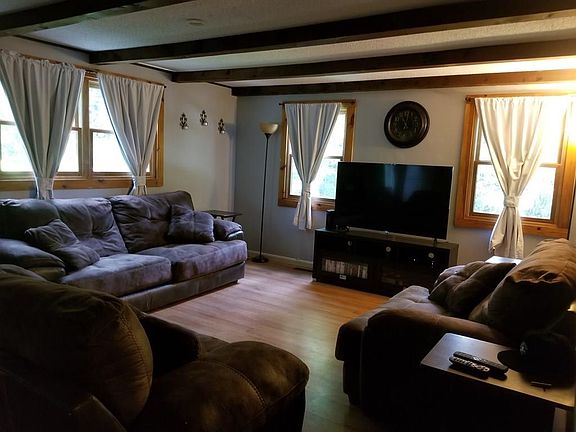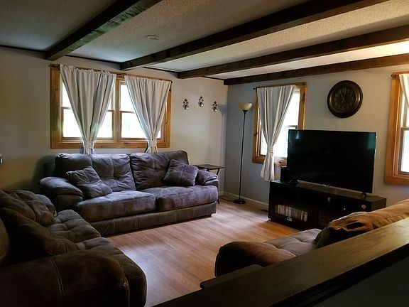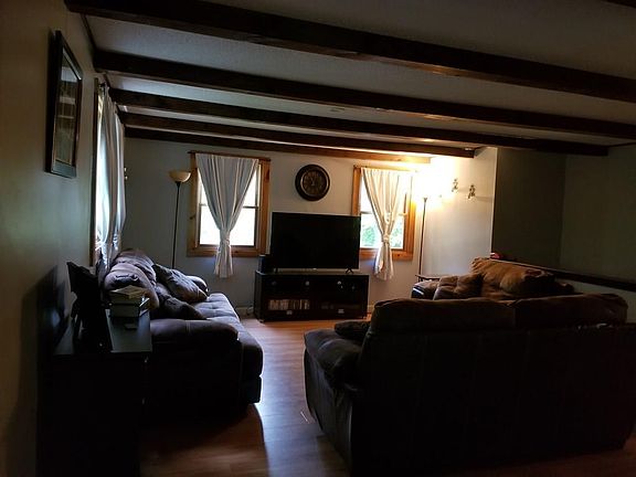 This raised ranch offers an oversized detached 2 car garage on an acre lot. 3 season screen room off the back overlooking private wooded yard. There are 3 good sized bedrooms. The living room ,kitchen and dining room all have beamed ceilings. living room opens to the kitchen which opens to the dining room. Dining room does have a fireplace but needs a new liner to be able to use it. The lower level has laundry and it has been started to finish 2 rooms down there,walk out basement and full windows. The house is vinyl sided and the garage is wood sided. There is a new 3 bedroom septic being installed.