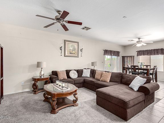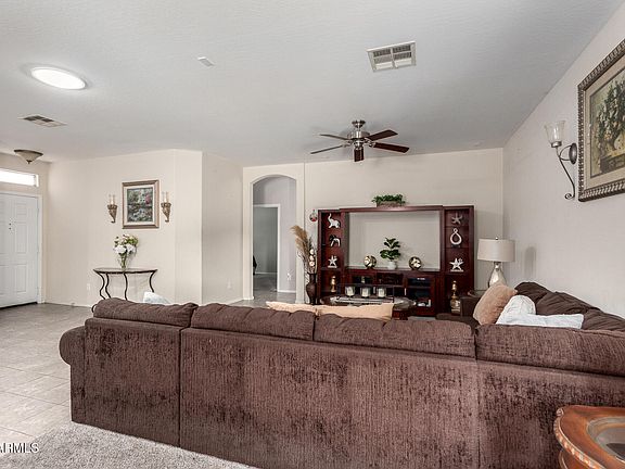 Welcome to this beautifully maintained 4-bedroom home featuring a 2-car sided garage! Discover a large open floor plan highlighted by tile flooring, ceiling fans, and neutral palette, perfect for both relaxing and entertaining. The kitchen comes with recessed & track lighting, plenty of cabinet space, mosaic tile backsplash, stainless steel appliances, granite counters, hanging pot rack, and a prep island with a breakfast bar. Check out the impeccable primary bedroom, complete with plush carpet, a private bathroom with dual sinks, an enclosed glass shower, and a walk-in closet. In the secondary bedrooms, you will have sliding door closets for added convenience. Unwind outdoors on the covered patio, an ideal spot to sit back and enjoy your favorite beverage in peace. Don't miss it!