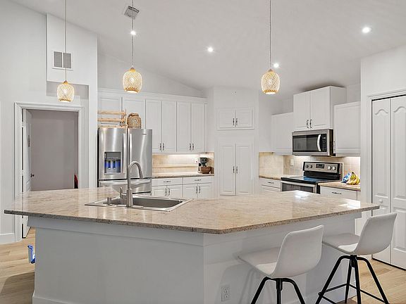 Welcome to your dream home in the heart of Port St. Lucie, perfectly set on a beautifully landscaped, nearly quarter-acre lot that offers both space and privacy. This single-story residence features four bedrooms and two and a half bathrooms across just over 2,300 square feet of thoughtfully designed living space. From the moment you step through the double-door entry, you're greeted by tall, vaulted ceilings, new porcelain wood look tile flooring and baseboards throughout, and an abundance of natural light pouring in through large windows and sliding glass doors. The open layout seamlessly connects indoor and outdoor living, with direct access to a covered lanai ideal for gatherings, relaxation, or enjoying your morning coffee. The kitchen is designed for both function and style, featuring stainless steel appliances, granite countertops, white cabinetry, and a spacious snack bar that makes entertaining effortless. The primary suite is a true retreat, complete with tray ceilings, dual closets, and an oversized bathroom with a separate soaking tub and shower. Recent upgrades add to the home's appeal, including a newly installed metal roof, AC, water heater, guttersall completed in 2023.