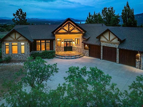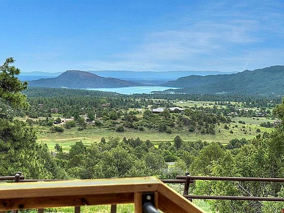 Whether planning to spend quiet times of peaceful privacy or entertain guests, this single-level home, designed by Durango architect, Laurie Anderson, is designed for enjoyment to the fullest. Expansive views of Lake Nighthorse and surrounding valley, Needles Mountains, and end-of-road, ‘top of the rim’ location provide a comforting setting that is challenging to match in this desirable Shenandoah Estates, large-acreage subdivision. The stellar views are not only seen from the living room, dining room, and primary bedroom, but also from the rear deck that spans the entire length of the home, as well as the sitting area on the patio with outdoor rock fireplace, creating ambience and multiple options for outdoor enjoyment. The 3.1 acre lot extends down the hill to the road, making it very likely that the unobstructed views will remain as beautiful as they appear today. The open floor plan that includes the foyer, great room, dining room and kitchen, offers elegance, ease of use, convenience and flexibility. The great room is adorned with large, exposed pine timber beams at the cathedral ceiling, access to the deck and tremendous views to the East through windows as high as sixteen feet. A two-sided gas fireplace separates the great room and a dining room. The dining room includes a wet bar with sink and ice maker, as well as butler service area. The considerably large kitchen is replete with granite countertops, two ovens, range top and appliances to satisfy the discerning home chef. The primary bedroom suite, located at the end of the hall, is spacious and inviting, with gas fireplace surrounded by river rock, access to the deck, and a large, full bath with dual vanities, jetted tub, walk-in shower and enormous closet with ample room. Additional bedrooms are separated by a large, full bath with separate vanity areas for privacy and function. One of the bedrooms has an oversized closet, while the other boasts a built-in Murphy bed and desk for home office to guest room flexibility. A large utility ‘mud room’ between the 3-car garage and kitchen offers convenience with laundry, storage and service sink. Easy access to backyard landscaping is provided via a walk-though door at rear of garage and vehicle-width gate to the side. Special features range from the hand-hammered copper lavatory in the powder room, to hardwood hickory and slate flooring, outdoor electric and gas service ready to add hot tub and gas grill, to a water collection system for irrigating decorative trees that includes a cistern and solar-powered pump. Guests arriving for a visit will experience inviting comfort stepping from the paved circular driveway to the raised slate front porch and pine timber architecture of the home entry. Once inside the front door, the open floor plan and panoramic views draw visitors in to an enjoyable and comfortable experience worthy of relaxing appreciation.