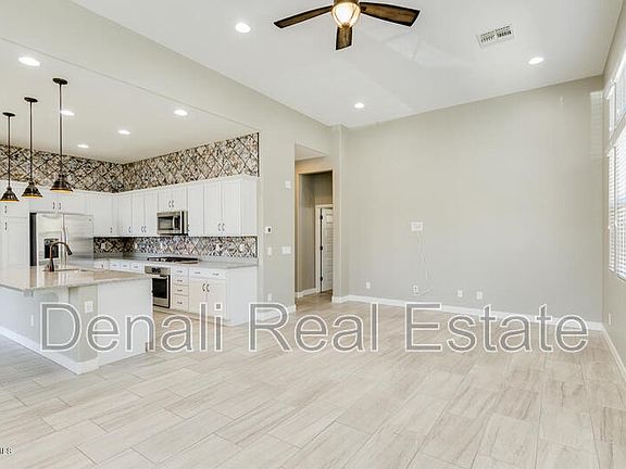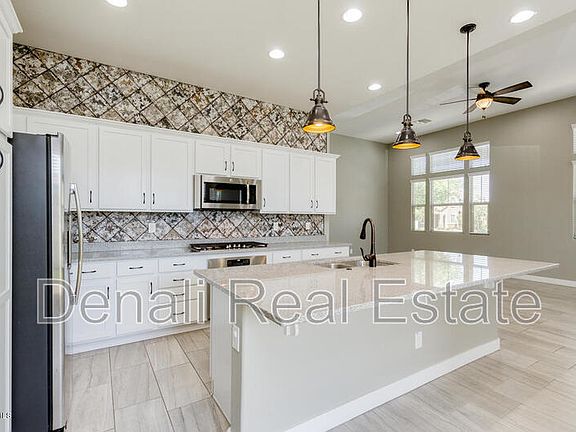 No Application Fees! Wonderful 3 bedroom, 2 bathroom single-level Gilbert home located in the desirable Bungalows at Cooley Station community. This home features numerous upgrades including 12 x 24 tile flooring in all main living areas, upgraded carpeting in bedrooms, neutral paint throughout, upgraded fixtures, ceiling fans in each room, and upgraded window blinds. The spacious kitchen boasts granite countertops, upgraded cabinetry, custom backsplash, a large island with breakfast bar, gas range, built-in microwave, refrigerator, and dishwasher. The primary suite includes a large walk-in closet, dual sink vanity, garden tub, and separate shower. The backyard offers a covered patio, white fencing, and synthetic grass for low-maintenance outdoor living. Washer and dryer hookups available.