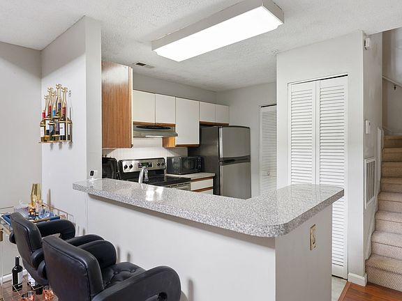 The kitchen comes equipped with essential appliances such as a stove/oven, fridge, and dishwasher. A nice bar area overlooks the living room so you can be in the action when entertaining. Also a small utility room houses a washer/dryer for convenience and extra storage