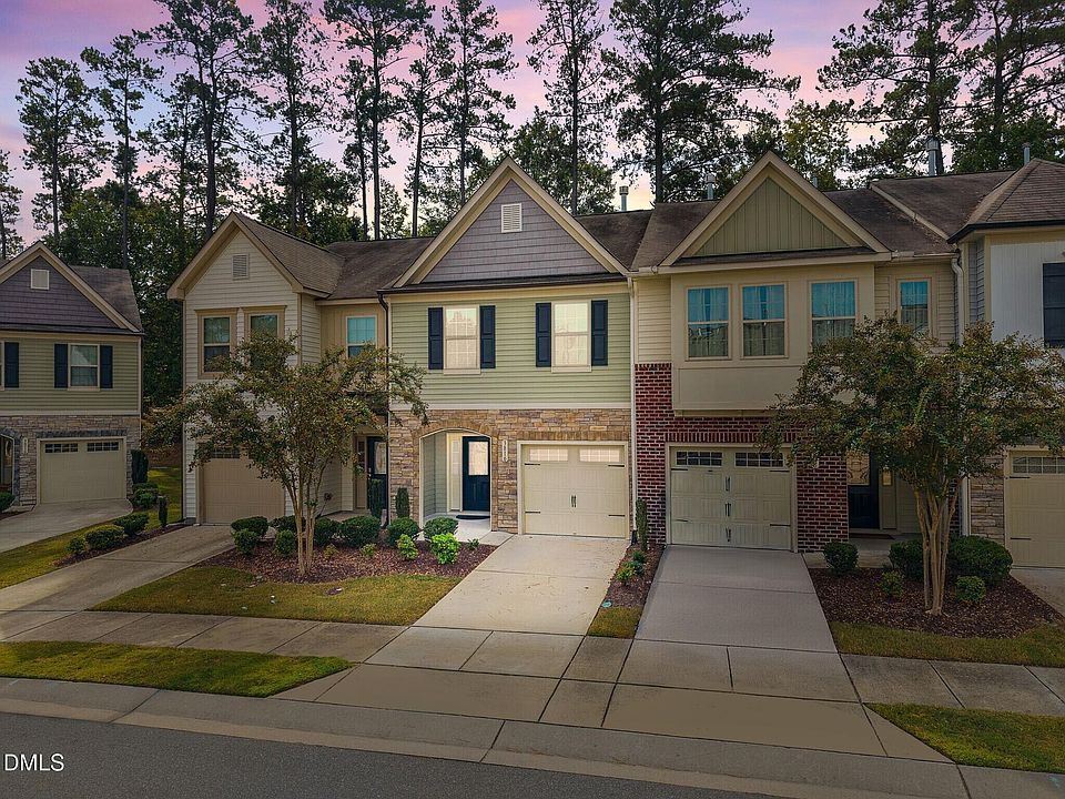 Welcome to 3810 Prince Noah Loop in the popular Stonegate Townhomes community—conveniently located near 401N and I-540. This 3-bedroom, 2.5-bath townhome offers 1,662 sq ft of comfortable living space plus a 1-car garage. Enjoy access to great neighborhood amenities including a clubhouse, pool, tennis courts, and playground. Luxury vinyl plank flooring and crown molding flow throughout the open main level. The family room with a corner gas log fireplace opens to the kitchen and dining area. The kitchen features granite countertops, stained cabinets, a center island with pendant lighting, recessed lighting, a pantry, and stainless steel appliances—including a double-door refrigerator with bottom freezer. A glass door leads to the backyard patio with peaceful wooded views. Upstairs, the spacious owner's suite features a tray ceiling, dimmer light switch, crown molding, triple window, and walk-in closet. The en-suite bath includes a dual vanity with granite, tile flooring, walk-in tile shower, and separate water closet. Two additional bedrooms, a full bath, laundry closet with washer/dryer, linen closet, and pull-down attic stairs complete the second floor. Other special highlights are upgraded blinds, hard wired for Ethernet cable throughout, pull-out drawers in 3 lower kitchen cabinets, all bedrooms and family room are wired for ceiling fans, WiFi dimming light switches for front porch, entrance hallway, and family room, water heater (2023), new garbage disposal (May 2025)