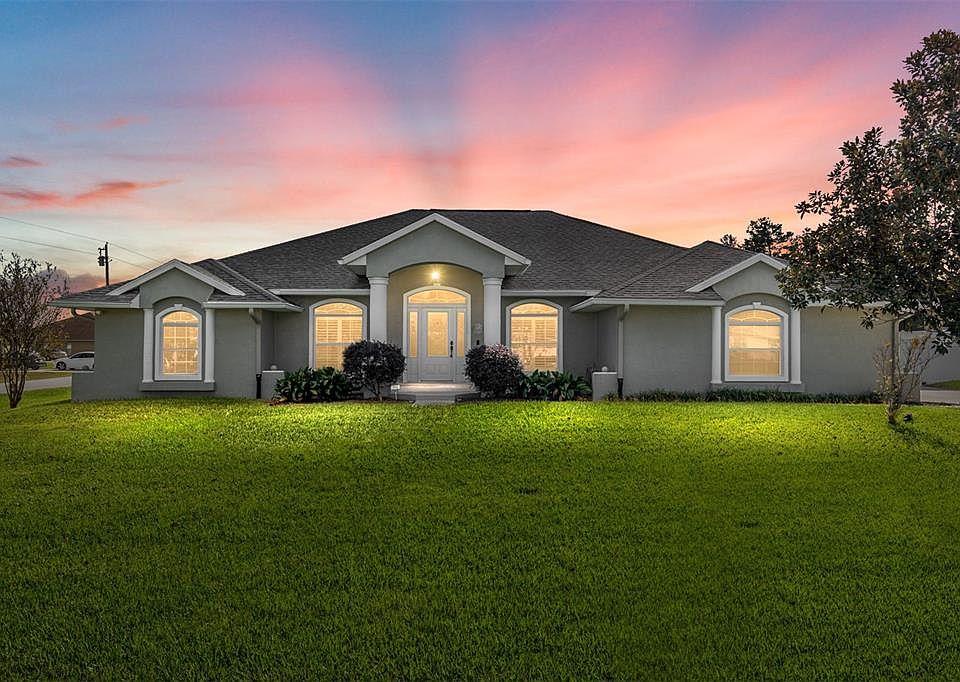 Beautiful 4 bedroom, 3 bathroom POOL home on spacious corner lot in the popular SW Ocala Waterway Estates! A grand entryway leads into a large living room with vaulted ceilings, overlooking a beautiful solar heated pool with three waterfalls! Office & formal dining room. Eat-in kitchen with updated stainless steel appliances, pantry, corian counter tops, tile backsplash and breakfast bar. Triple split plan allows for the ultimate privacy. Spacious master suite features tray ceiling, pool access, huge walk-in closet, walk-in linen closet, dual sinks, roman shower, jetted tub and a separate water closet. Built-in hall desk, inside laundry, tons of storage! New roof 2022. New AC 2022. New pool solar panels 2021. 5 Zone irrigation system and updated St. Augustine grass. Full Ring camera system conveys! This house is move-in ready and won't last long. Schedule your private showing today!