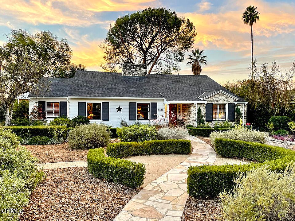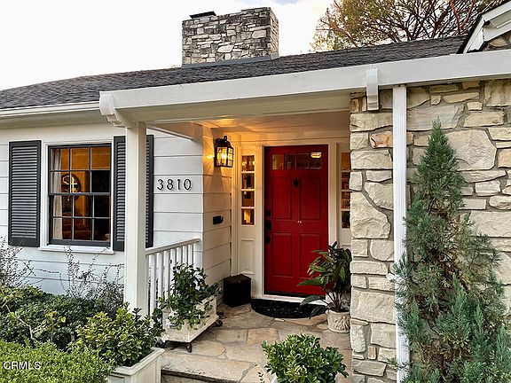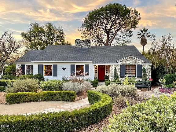 Set on a gently curving lane, on the second largest lot in coveted Lower Hastings, is this beautiful traditional style 4 bedroom home. Clapboard siding, soft black shutters and a red door hint of Nantucket, while the front yard orchard is all native California (awarded the Golden Arrow by Pasadena Beautiful Foundation). A gracious entry welcomes guests into the spacious living room, appointed with a fireplace and a wall of library shelving. The north exposure offers views of the mountains. Adjacent is the heart of the home, the kitchen, great room and dining room, all open to each other and all featuring wood beamed ceilings and natural light provided by south and west facing French doors. The kitchen boasts high-end GE appliances, a six burner stove, a wine fridge, and built-in convection/microwave with a warming drawer below. This is truly a space for daily gathering and entertaining. Wood cabinets and stone countertops add to the warmth of the room. Dine by firelight in the dining room or sip tea in the bay window niche with display shelves. The sun-filled family room opens onto the covered brick patio, a lovely spot for morning coffee or dining al fresco. The primary suite is a perfect sanctuary with a walk-in closet and charming bath. The fourth bedroom is currently being used as an office. A separate mud room at the driveway and a laundry room between the secondary bedrooms complete the interior. The private, tree-studded yard is California living at its best, offering many spaces in which to entertain and relax. There are two lawns, vegetable boxes, a central firepit, multiple patios for dining or lounging, and a salt-water pool anchored by an arbored-patio draped with wisteria. Above the charming 2-car garage is a bonus room for an art studio, home gym or play room. A 'Little Library,' registered to the home, sits at the end of the driveway, to be curated by the new owner. Truly a special property!