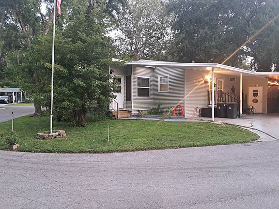 Located in a very active 55+ community with amenities and close to shopping, restaurants and medical facilities. Pet friendly, pool, shuffle board with a great clubhouse that entertains all types of activities or you can just live a quiet peaceful time in your new Florida home. On a corner lot with lovely trees and landscaping surrounding this lovely home you will be pleasantly surprised to find a nice carport with a covered area that includes overhead lights and seating area to enjoy the weather. There is also a laundry room with a washer and dryer along with storage area. Around the back of the house is a large shed for more storage and also a nice open patio area with a fire pit. In the home, which is furnished, is a comfortable open floor plan. The kitchen has granite countertops and tile backsplash along with plenty of cabinets for storage and great lighting. Newer appliances also are included in this home. Interior has been painted, tile and laminate flooring throughout. Off of the living area is a separate Florida room with it's own portable a/c unit, tile flooring for easy cleaning and surrounded by windows to enjoy the weather. The primary bedroom is quite spacious and has an ensuite with tub/shower. The guest bathroom has a lovely, tiled walk in shower. There was no flooding in the area of the home so nothing to worry about living in this home. New metal roof and new central a/c unit makes this home worry free and well worth the price. Call now to schedule an appointment and see for yourself. Priced to sell with low lot rent of $660 per month; please contact management to verify rent amount.