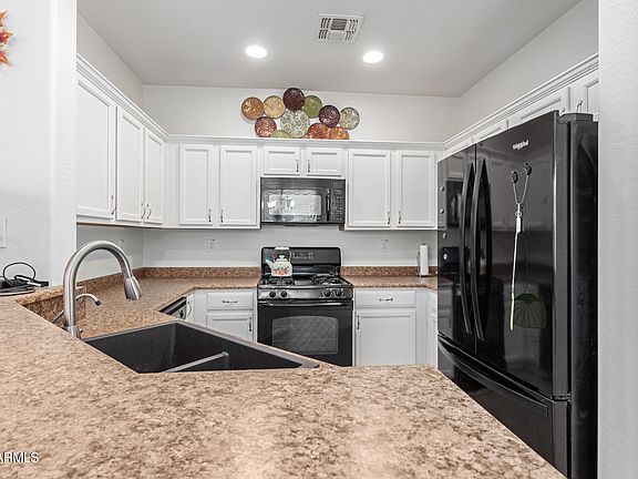 This beautiful 3-bedroom, 2-bath home in Anthem boasts 1432 sq ft, featuring a Great Room floor plan with split bedrooms. The interior has been freshly painted and new carpeting installed in the bedrooms. The kitchen, which overlooks the family room, is equipped with black appliances, a gas stove, and a pantry.