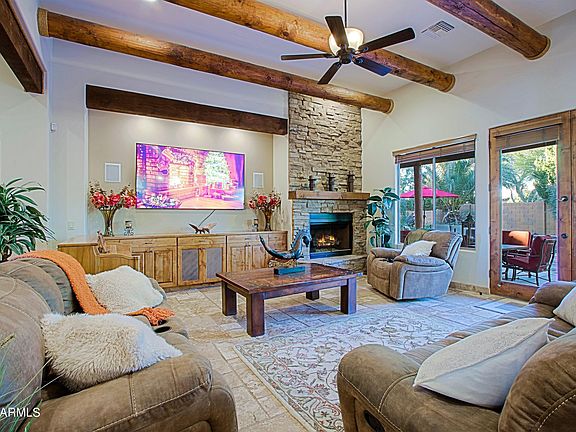 Come enjoy sunny Arizona, Great location, close to Cave Creek, Carefree restaurants, shopping, hiking trails. Stunning custom Territorial home on 1 acre land, no HOA, RVs allowed, paved roads, fully furnished 4 bedroom, 2.5 bath, 3 car garage vacation rental with heated pool and spa. Backyard features large covered patio perfect for entertaining and Arizona's outdoor living, heated PebbleTec pool with relaxing water features, built-in BBQ and fire pit, luxury patio furniture. Gourmet kitchen includes GE Monogram stainless appliances, wall ovens, built in fridge, granite countertops. Luxury finishes t/o: travertine floors, wood doors... Owners retain exclusive use of RV garage. Oct-April- $8K a month, May-Sep- $6000 a month. Utility charge $500/month added to rent. Pets landlord approval Detached guest casita offers kitchenette, full bath and queen size bed. Fireplaces, Pool and spa heated by propane, Tenant is responsible to pay for propane in addition $500/month utility charge.