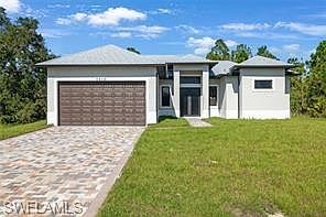 ** NEW CONSTRUCTION HOME. It's waiting for you !! Prepare to be impressed by this DELI GHTFUL NEW HOME in Lehigh Acres. The desirable 1600 sq ft plan boasts a well-appointed kitchen with an open floor concept. Home features are gorgeous contemporary shaker-style 36" cabinets, granite countertops, stainless steel appliances, and an island with bar seating. The private owner's suite features an attached bath with his/her walking closet, his/her sink, and a separate water closet room. Tray ceilings, lanai under trust, impact-resistant windows, and doors, all tile floors, 2 car garage. (Pictures reflect from another house with a similar floor plan) agents, please see confidential remarks.