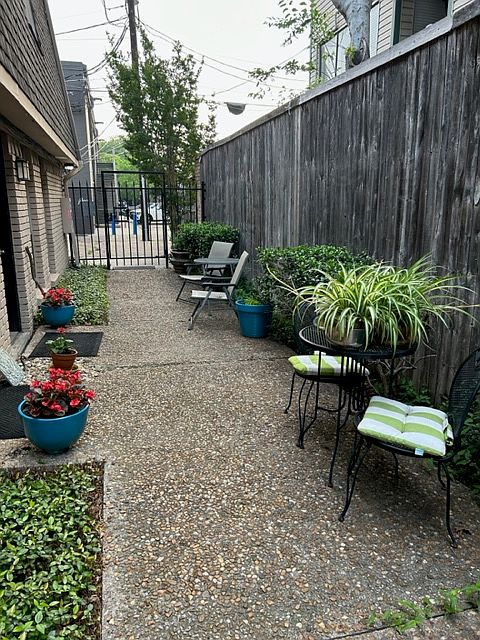Wonderful apartment in the thriving Oaklawn area, with beautiful tree lined streets and walkability plus! This 2 bedroom and one half bath features hardwoods downstairs in the living areas, Cute courtyard area with landscaping in the front and a spacious patio yard in the back off of the dining room and kitchen. An abundance of recessed lighting in the living room, natural light, kitchen off of the dining and ample parking in the front and back areas of this gated community. The bedrooms upstairs are large and have nice closet spaces. Laundry in half bath downstairs. The bathroom up is updated and a nice half bath is downstairs with additional storage. Location location! Walk to many restaurants and shopping! Just a few blocks from the Park Cities. Excellent parking in both the front and back areas of the property and the complex is gated.
