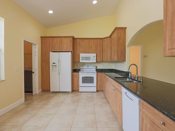 This exquisite 3-bedroom + den, 2-bathroom CBS home boasts elegance and functionality. Leading up to the house is a lengthy paver drive with plenty of room. Offering a spacious 2-car garage with high garage door, tile flooring throughout, and luxurious granite countertops. Tall ceilings and 8 foot doors throughout enhance the open ambiance, while the split bedroom layout offers privacy and comfort. Enjoy the serene screened-in patio with high ceilings that extends almost the length of the entire house with several sliding doors leading out, perfect for relaxing or entertaining guests - also with a separate sliding door from the master bedroom and a cabana bath when needed. Freshly painted interior. City utilies. Easy access to I-95 for commuters and also a few minute drive to the turnpike