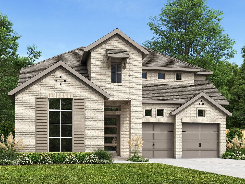 Two-story entry with 19-foot ceilings. Home office with French doors just off the entry. Two-story family room with 19-foot ceilings features a grand wall of windows. Island kitchen with built-in seating space and a walk-in pantry and flows into the dining area. Secluded primary suite with a wall of windows. Primary bathroom features French doors, dual vanities, garden tub, separate glass enclosed shower, linen closet and generous walk-in closet. An additional bedroom downstairs with walk-in closet. Second level hosts a large game room, secondary bedrooms with walk-in closets and a Hollywood bathroom. Utility room offers a private access to the primary suite. Covered backyard patio. Mud room just off the three-car garage.