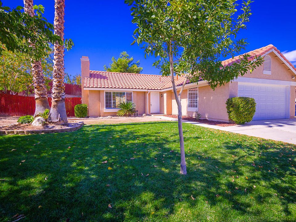 Perfect for first-time buyer, Spectacular and Cozy West Palmdale Home in Great location close to schools, shopping and freeway access, Hurry and show this home will not last! Home features beautifully landscaped front yard, custom two-toned interior paint, laminate and tiled flooring, and upgrades throughout you will fall in love. Laminate flooring upon entry; high vaulted ceiling living room with tiled gas fireplace w/white mantel; open concept entry into kitchen which displays beautiful porcelain tiled flooring, granite counter-tops, white cabinets with modern stainless-steel hardware, stainless double bowl sink with brushed nickel pull-down faucet, New appliances, recessed lighting, chandelier in dining area, and sliding glass door that leads to covered patio
