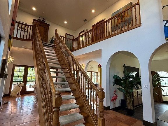 At the heart of the home, the chef’s kitchen is a true masterpiece—crafted with custom cabinetry, a large pantry, premium appliances, including a gas range, and a grand center island ideal for entertaining. Throughout the estate, designer touches abound—from the custom tile work and iron accents to the tailor-made closets in every bedroom. The fireplace in the formal living room, with its Spanish architectural influence, stands as a centerpiece of timeless beauty, complemented by traditional Saltillo tile floors and an exquisite courtyard. A second floor balcony runs the entire length of the rear of the home which allows you to take in breath taking sunsets.