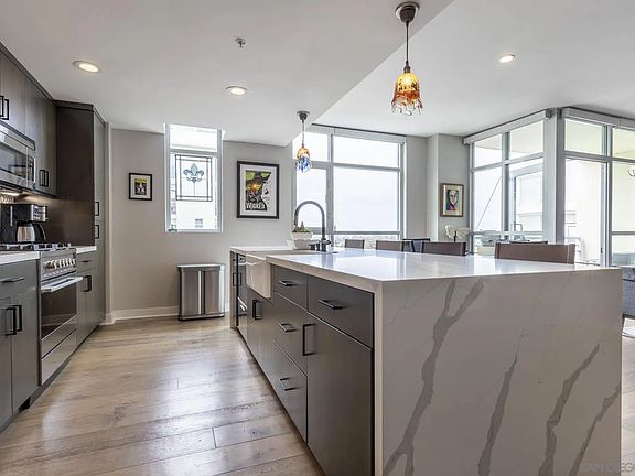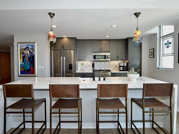 Welcome to the iconic Egyptian building in Hillcrest! Known for its modern design and spacious floor plans that feel more like a single-family home than a condo, this building offers the best of both worlds. Solidly constructed with steel and concrete, these quieter units are a rare find in Hillcrest. Unit 408 is a south-facing corner unit overlooking the Egyptian courtyard, boasting a majestic view of Balboa Park, the Historic California Bell Tower, and Downtown. The open living space, bathed in natural light from floor-to-ceiling windows, is perfect for relaxation or entertaining. For added privacy, the bedrooms are located on opposite sides of the unit. Extensively remodeled with over $150K in upgrades, this condo features engineered wood flooring, high-end Fisher & Paykel appliances, a quartz kitchen counter with a farmhouse sink and waterfall island, elegant dolomite marble bathrooms, LED-lit bathroom mirrors (including a heated, anti-fog, dual-lit primary spa mirror), motorized window treatments with remote controls (including blackout shades in bedrooms), and a new LG WashTower. Experience the epitome of San Diego living in this stunning, luxurious condo!