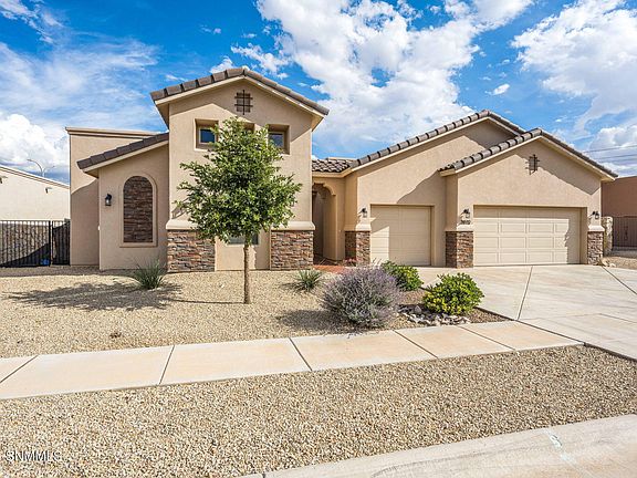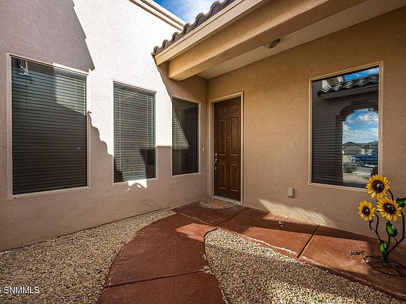 You will LOVE THIS beautifully crafted 5-bedroom, 3-bathroom home by Veloz Homes, offering over 2,700 sq ft of luxurious living space and exceptional design throughout. Nestled in a Red Hawk Estates with breathtaking views of the Organ Mountains. Enjoy outdoor living at its finest with a south-facing backyard that features an in-ground pool, artificial turf, a covered patio with a built-in fireplace and grilla'perfect for entertaining year-round. Rock walls provide added privacy, while the front courtyard offers a charming space to relax or greet guests.Inside, you'll find a thoughtfully designed split floor plan with high ceilings, nichos, and an open-concept layout. The gourmet kitchen boasts granite countertops, stainless steel appliances, and ceramic tile. Youll love the launrdy room entry from the master closet, all the little extras in this amazing home the second you step into the courtyard. Call for your showing today.