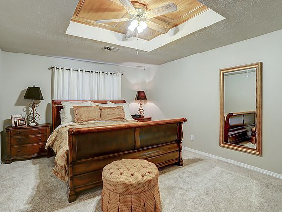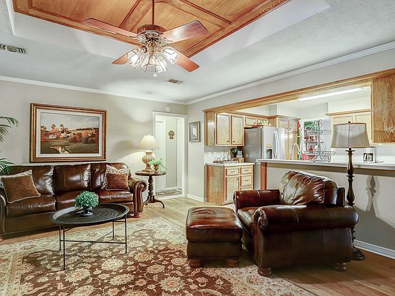 Single story 3/2/2/ attached garage home featuring a split floor plan,spacious master suite,double walk in closets, and custom cabinetry in master bath. Recessed ceiling with paneled wood in both the living room and master suite. New carpet in bedrooms and hallways, tile in both bathrooms, wood flooring in formal dining room. Interior paint (2018) New stove and vent hood. Spacious sun room overlooking the back yard, storage building and covered patio.