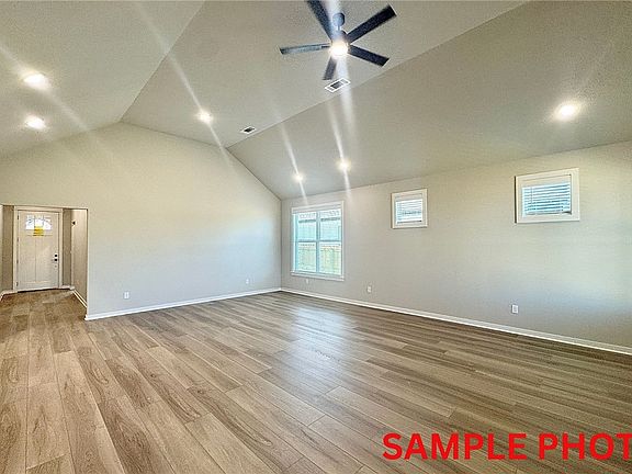 Fence, blinds and gutters included! Discover your dream home in the new neighborhood- Jacob's Crossing. Caden plan with 1 level, garage on the left & West facing! 13 ft ceilings in the living and dining, linear electric fireplace, LVP flooring throughout the main living areas & primary bedroom, quartz countertops & more. Chef's kitchen boasting frigidaire stainless steel appliances, gas range, pantry, quartz countertops, bar pull handles, large island & gorgeous backsplash. Luxurious primary bedroom features abundant natural light, while the spa-like primary bathroom offers a walk-in shower, double sinks, tub & spacious walk-in closets. Additional features include two large secondary bedrooms & a functional laundry room. Nestled on a generous lot with covered patio that overlooks the serene sodded, fully fenced backyard, creating an exceptional living experience. Sturdy concrete siding! Model home located at 3631 Tranquility St- Lot 1.