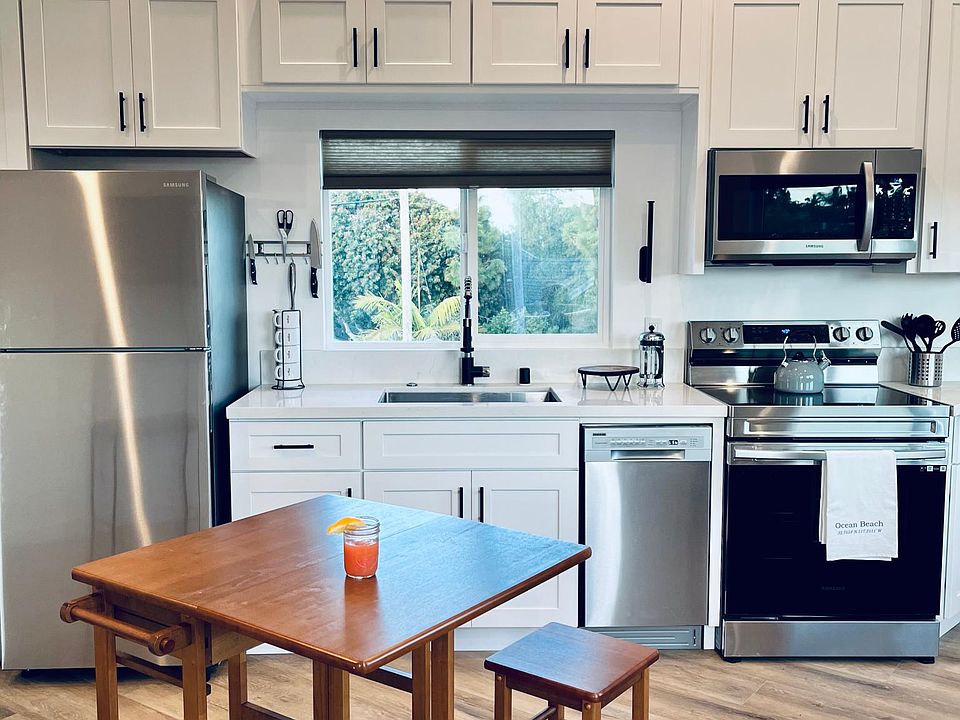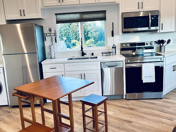 Fully furnished new construction in the Ocean Beach/Point Loma community! Utilities paid by landlord including WiFi! Perfect for traveling professionals, travel nurses, students, or someone in escrow. Currently 3-12 month lease available. 2 units, this is the upstairs unit. 1.4 miles to the beach, AC/Heat, double paned windows, fridge, dishwasher, microwave, oven, washer dryer combo, beautiful full bathroom, bedroom with closet, hardwood floors, immaculate throughout! Smart TVs in the living room and bedroom. Nice outdoor patio, private entrance with security lighting, central to all hospitals and freeways. Plane noise does affect the Point Loma area, with the AC/Heat and double paned windows, guests enjoy privacy and quiet in this beautiful new unit.