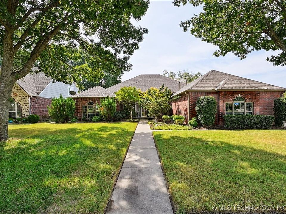 Dream House with gorgeous Sunroom and beautiful Italian Fountain backyard at Corner Lot in Cul-de-sac !!! Family friendly Pecan Grove neighborhood, close to Creek Turnpike and highway 169. One story plan, 3 bed/ 2.5 bath, 3 car garage with custom flooring and granite wash station. Kitchen with granite and island, walk-in pantry. Huge Master Suite, over-sized closet with dressing mirror, spa whirlpool tub, and walk-in shower with bench. Formal dinning/ office. Sunroom with climate controlled and triple pane windows to completely eliminate outside noise. Over-sized laundry room. Beautiful custom fabric shades in all rooms. Professional landscape. Generac Guardian Series. Ready to move in to enjoy peaceful life in city !