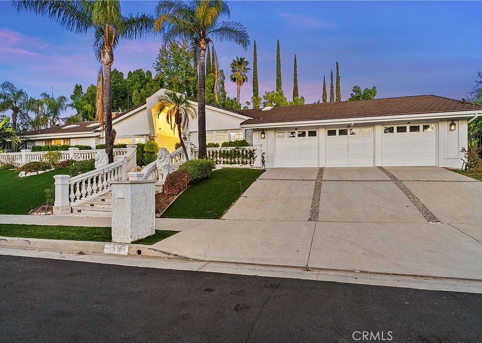 This stunning single-story entertainer's estate boasts an impressive 188 feet of frontage and exquisite upgrades throughout. Step inside to find marble floors with intricate inlaid mosaic detailing, designer faux finishes, elegantly updated bathrooms, custom doors and windows, and stone fireplaces that create an atmosphere of luxury and warmth.