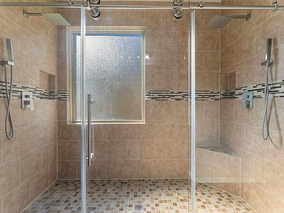 Stone and brick elevationGarage door openerCeiling fansWood-look ceramic tile flooringSoaring ceilingsCrown moldingOpen to the kitchen