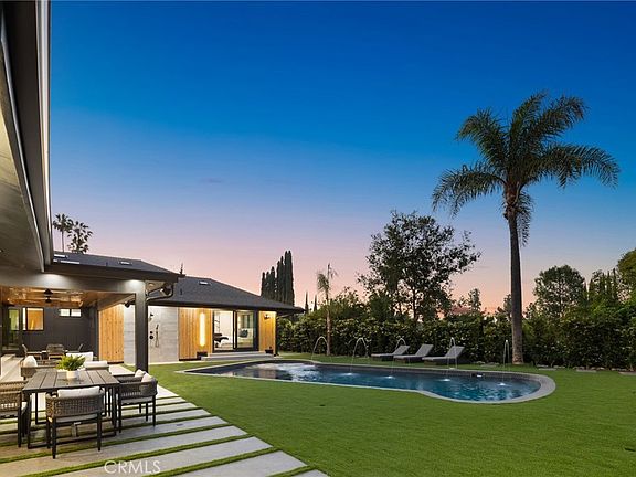 Welcome to your exclusive haven in Sherman Oaks – a luxurious single-story retreat that defines elegance and sophistication. This custom-rebuilt home boasts 5 bedrooms and 5.25 bathrooms across 3,650 square feet, seamlessly blending modern opulence with timeless design elements. Tucked behind private gates, it sits on a spacious 23,000-square-foot lot, ensuring unparalleled privacy and serenity. Guests are welcomed into an expansive floor plan where wood-beamed high ceilings adorned with skylights welcome you into luxe finishes European Oak flooring and bespoke Birch custom cabinets. The centerpiece of the home is a culinary masterpiece, featuring an 8-burner double oven Wolf range, a 60-inch Sub-Zero refrigerator, and sleek black aluminum windows framing stunning views of the surrounding hills. Entertaining is effortless in the ultra-private backyard oasis, where two panoramic doors open to a covered patio with Rainier Natural custom Cedar ceilings and built-in heaters – perfect for al fresco dining or lounging by the outdoor fire pit. The Baja entrance heated saltwater pool and spa, outdoor kitchen, and shower complete the outdoor retreat, providing the ideal backdrop for luxurious gatherings. Inside, the bathrooms exude sophistication with integrated countertops, while custom mirrors imported from Turkey add an international flair. State-of-the-art technology is seamlessly integrated throughout the home, with a smart system accessible via iPad to control lighting, air conditioning, music, and security cameras. For automotive enthusiasts, the oversized driveway accommodates at least six cars and is complemented by a 2-car garage. All systems are brand new, including a 400-amp electrical panel, ensuring modern convenience and efficiency. Embrace the epitome of luxury living in this meticulously designed Sherman Oaks residence close to shops, fine dining and more.