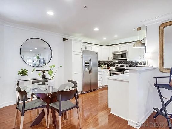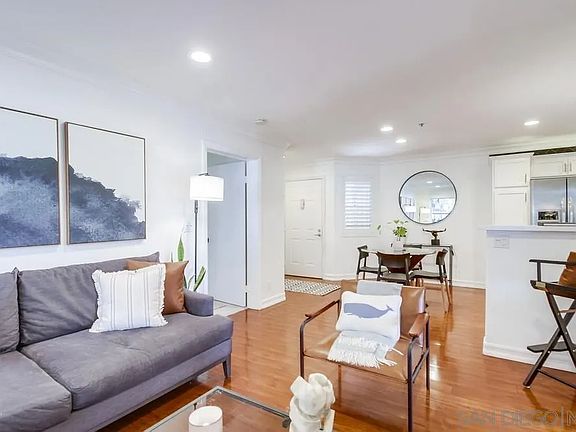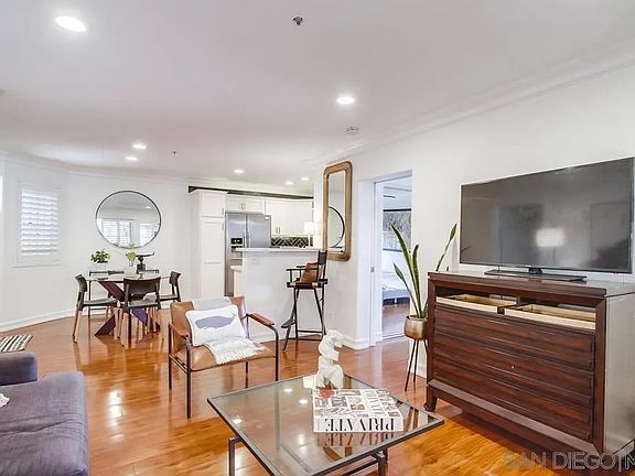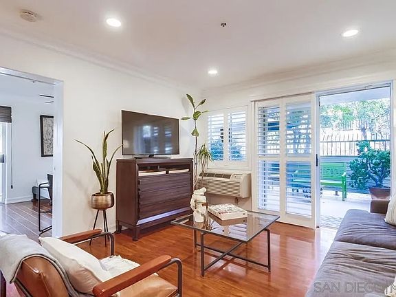 Step into this exquisite turn-key 2-bedroom, 2-bathroom corner unit, meticulously designed to perfection! Discover crown molding gracing every corner, bespoke shutters adding charm, and stunning flooring enhancing the ambiance. The expansive open kitchen boasts custom cabinets and modern appliances, making it a culinary dream. With a split master layout, each master suite presents spacious bathrooms and ample closet space for your convenience.Enjoy not one but two outdoor areas; the main patio alone spans nearly 200 sqft, ideal for relishing our enviable weather. Your laundry room is conveniently located just outside the unit, adding to the ease of living. Parking is a breeze with two assigned garage spaces and two additional storage units, ensuring you have ample space for all your belongings. This property offers everything you need to thrive and embrace the vibrant lifestyle that Hillcrest has to offer.