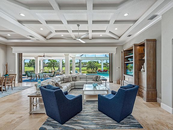 Immediately upon entering this high-quality home, built by highly-regarded Stock, you'll be impressed by the expansive golf course and lake views enjoyed from nearly every room in the house. Perfect southwestern exposure offers plentiful natural light and stunning sunsets overlooking the lush greens and water. Dramatic double-door entry, soaring ceilings, contemporary lighting and massive 35-ft sliders open the great room to the expanded screened lanai with heated saltwater pool with sunshelf and zero-edge spa, firepit, pool bath, super screens, ''picture window'' openings, gas fireplace, speakers, wood ceiling on covered space and full outdoor kitchen. This spacious and comfortable luxury home features 4,238 square feet of living space including 4 bedrooms plus study, 4 ½ baths and 3 garage spaces with epoxy floors. Interior features include travertine floors, plantation shutters, coffered and tray ceilings and updated, high-end ceiling fans and lighting and custom-built white wood valance and automated shades. Conveniently located on the first floor is the primary suite with vaulted beam ceiling, hardwood floors, spacious walk-in closets with California-style built-ins, direct lanai access, vaulted ceiling, and a gorgeous updated ensuite bathroom with his and her vanities, walk-in shower with quintuple shower heads, quartz counters, modern fixtures and faucets, frameless walk-in shower, water closet and a soaker tub. On the main living level, you will also find the study with glass front doors and hardwood flooring, and a guest bedroom that doubles as a second primary suite, also with an ensuite bath and lanai access. The updated open kitchen is appointed with premium white cabinetry, new quartz countertops, large island, mirrored tile backsplash, Subzero refrigerator, Wolf oven with warming drawer, Wolf stove and microwave, Blanco sink and Miele dishwasher. A beautiful hardwood stairway leads to the second level with two bedrooms, two full baths, a balcony and a second living room. Additional quality features include impact glass, tile roof, and paver driveway. Laundry room boasts ample storage and Maytag washer and dryer. Located in the prestigious double-gated Isla del Sol neighborhood in Fiddler's Creek, where residents enjoy exceptional amenities including two resort-style pools with pool-side service, a magnificent 54,000 square ft clubhouse, two restaurants, spa services, new fitness equipment, daily fitness classes, sauna, steam room, pickleball, bocce, tennis and a very active year-round social calendar with something for everyone. Rare opportunity to become an immediate member of the private equity Golf Club at Fiddler's Creek with a brand-new golf clubhouse and exciting current turf renovation. Optional beach club and marina memberships available.