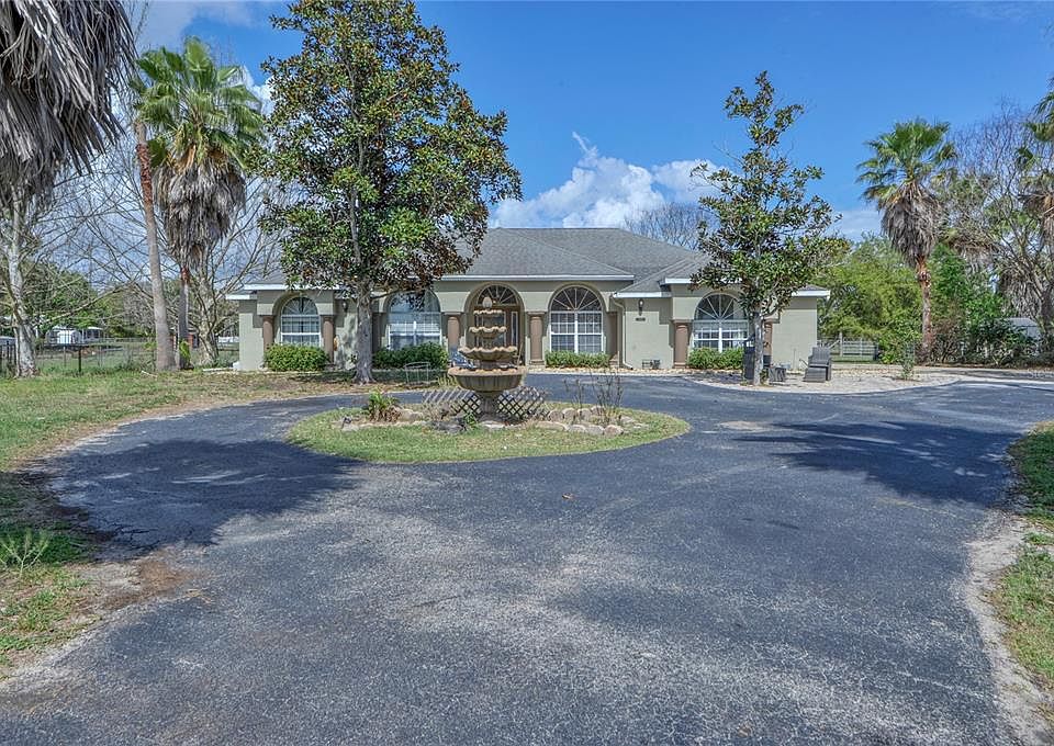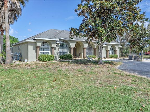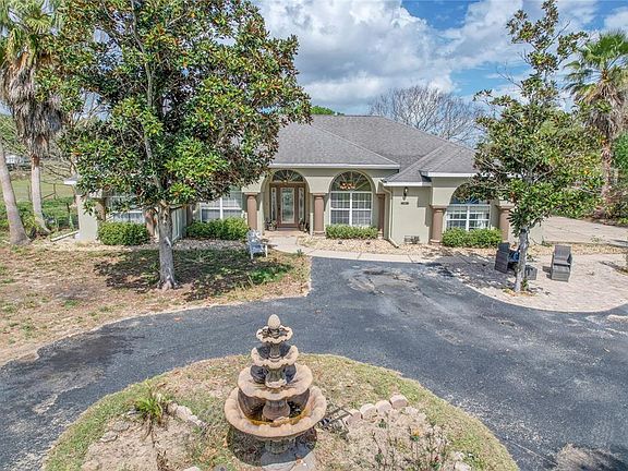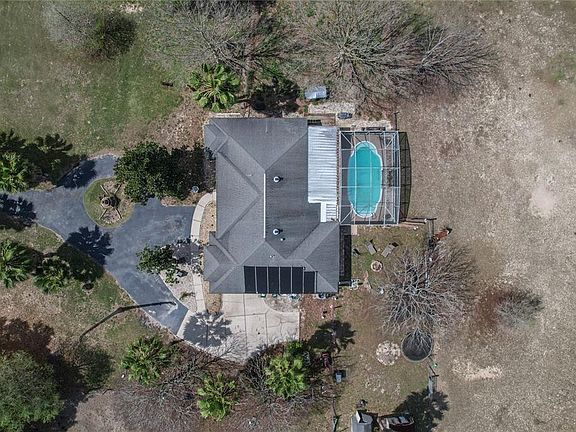 Bring your horses and your other furry friends. 4.8 Acres fully fenced with an expansive 4 bedroom, 2.5 bath home with heated pool and 2 car side-entry garage. When you drive up to the drive, you will notice the circular drive and the home with large windows out front with eyebrow windows above for lots of natural light. Enter through the leaded glass front door into the tiled foyer and notice to the right the large formal dining room. The kitchen is large and features light color cabinetry with a full suite of black stainless steel appliances French door refrigerator, glass top stove, dishwasher and built-in microwave. Nice tile backsplash and a breakfast nook as well. All bedrooms have wood look tile. The master boast a large ensuite bath with dual sinks, soaker tub, walk-in shower and walk-in closet. Off the master there are French doors to lead to the large lanai. The guest bath has a tub/shower combo. From the living room you have French doors to the lanai where you have plenty of room for entertaining with the in-ground pool under the birdcage. Outside you will find the property is fully fenced with paddocks for your animals. There are some sheds for storage. Country living with the convenience of town only minutes away. New HVAC 2022