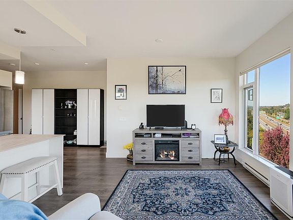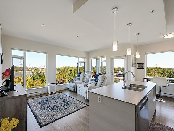 Top floor corner unit situated in the best location of Uptown Place. Enjoy views over Swan Lake as you watch the sunrise. Built by Jawl Developments this home offers an unparalleled blend of sophistication and modern living. Open concept design provides an abundance of natural light, with floor-to-ceiling windows showcasing mountain & lake views. Expansive kitchen complete with sleek s/s appliances, large island & lots of storage. Spacious living room offers plenty of space to relax & entertain. The primary features a spacious walk-in closet leading to the spa-like ensuite. Second bed offers generous closet space & easy access to the 2nd full bath. Recent updates include full size W & D, kitchen countertops, new toilets and carpets in the bedrooms. BONUS TWO secure parking stalls, large storage locker & bike storage. Pet friendly, rentals permitted. Steps away from Uptown Village, Whole Foods, shopping and more. Easy access to downtown, Galloping Goose trail, highway & major bus routes