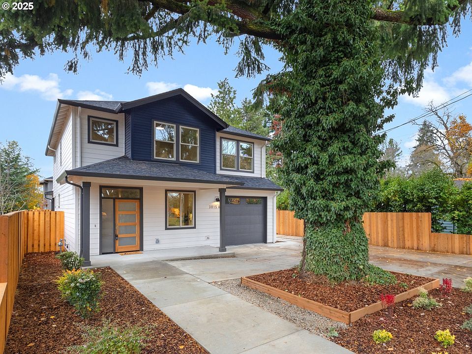 Prepare to be amazed by this stunning Pacific Northwest contemporary home. This remarkable new construction showcases an impressive open-concept layout—perfect for modern living. Thoughtfully designed to feel even larger than its 2,187 square feet, the home delivers both spaciousness and style. Every detail reflects the craftsmanship of a premier builder, with a custom kitchen, designer finishes and fixtures, engineered hardwood floors, exquisite tile work, and quartz counters throughout. High ceilings and an abundance of windows create a bright, airy atmosphere on both the main and upper levels. Entertaining is effortless here. The natural flow from the living and dining areas to the large covered patio, and the fully fenced backyard beyond, makes the entire main level ideal for gatherings year-round. Upstairs, the primary suite features a deep walk-in closet and a luxurious bathroom with a soaking tub, dual vanity, and beautifully tiled walk-in shower. The two front bedrooms have a serene, treehouse-like feel, with windows that look out toward a magnificent Douglas fir and the always-inviting Essex Park. A fourth bedroom on the main level provides a perfect space for a home office or guest room. On the practical side, the home’s exceptional energy efficiency—earning a 10/10 Home Energy Score—means lower utility costs and a lighter environmental footprint. While it’s part of a three-home condo community, it lives like a fee-simple home. The small HOA covers a shared insurance policy, annual filings, and tax preparation, with no costly maintenance reserves or restrictive rules. And the location? Simply outstanding. Enjoy a Walk Score of 83 and a Bike Score of 99, in a peaceful SE Portland neighborhood known for its convenience and livability.