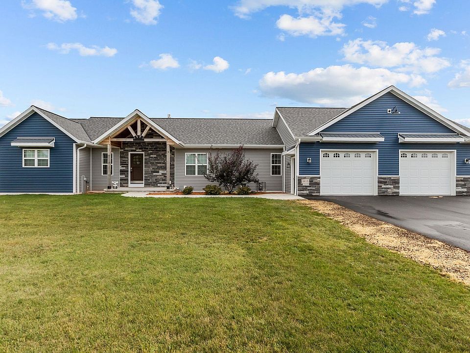 Modern 3-Bedroom Ranch on 3.67 Acres with 5+Car Garage Capacity and NEW ASPHALT DRIVEWAY!! This stunning, three-year-old ranch home sits on 3.67 acres and offers a rare combination of modern living, wide-open space, and unmatched garage capacity. Featuring three spacious bedrooms and three full bathrooms, including two en-suite bathrooms, this home is designed for both comfort and functionality. Enjoy a bright, open-concept layout with tasteful finishes throughout and a fully equipped kitchen with all appliances included—ready for everyday living or entertaining guests. Attached is a 2.5-3 car garage, perfect for daily use, but the real gem is the detached 5+ car garage—built with plumbing and electrical, ideal for car enthusiasts, a workshop, or even a home-based business.