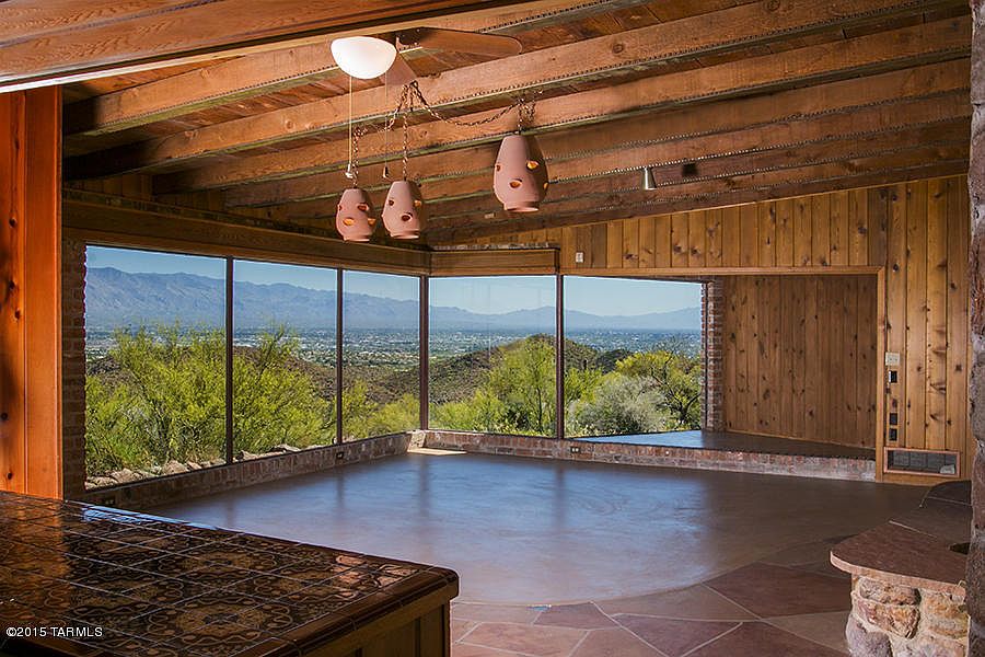 ENJOY SERENE MOUNTAIN VIEWS FROM EVERYWHERE AROUND THIS HOME! Panoramic views of Multiple Mountain Ranges and city lights. Property sets on the hill top so views will not be obstructed. Beautiful Classic Tucson home with 2 fireplaces, covered porches, charming Arizona Room, outside patios, stairways to viewing areas, and large storage shed. Polished concrete floors throughout with flagstone in the entry, front bedroom and Arizona room. Fabulous large picture windows in the living room. Outdoor stairway perfect for setting up a telescope or quiet relaxation soaking up the views!!