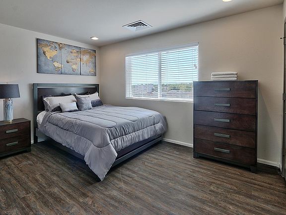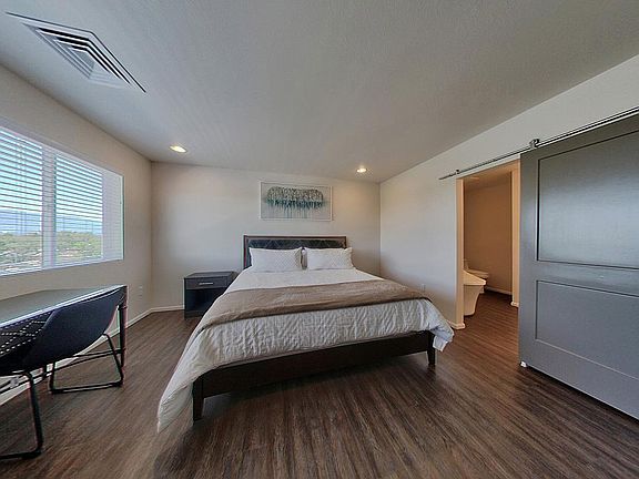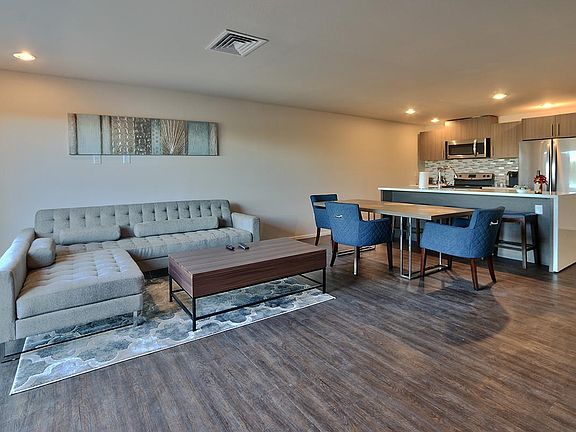 FURNISHED UNIT! Available 11/5/2025. This stunning two story townhouse style condo features three bedrooms and three full baths. Unit is fully furnished and meticulously designed with soft and warm wood-look flooring and large windows. The entry is on the third floor and contains thoughtful, contemporary & practical furnishings. Entertain in your new designer kitchen with stainless steel appliances and quartz countertops featuring a large island with gorgeous waterfall edge. There's also a French door refrigerator with ice maker, dishwasher and garbage disposal. The private terrace is over 250 sqft and features breathtaking views of the Sandia Mountains. Spacious master bedroom.