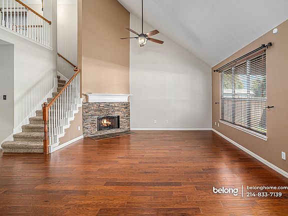 Stone fireplaceLarge lofted areaRich wood floorsBlack appliancesGranite countertopsAdditional seating areaWater fountain