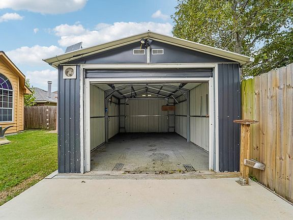 Move-in ready 4-bedroom home in Hunters Ridge offering space, comfort, and a rare 14×20 powered workshop with an upgraded climate-controlled garage featuring epoxy floors and a generator connection. The first floor features a bright, open living area with a custom fireplace accent, granite kitchen counters, updated tile flooring, and modern lighting throughout. The primary bedroom is conveniently located downstairs, while the second floor includes three additional bedrooms and a versatile game room ideal for family living, guests, or a home office. Roof, flooring, and several fixtures are under four years old, providing added peace of mind. The backyard includes extended concrete areas, a storage building, and space to relax, entertain, or work on projects. Conveniently located near schools, shopping, and major Baytown freeways. Select photos include virtual staging to illustrate furniture placement and room potential.