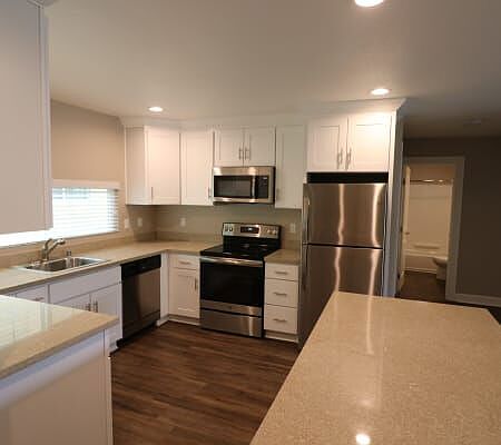 - Exterior features: Fully Equipped Kitchen, Kitchen Island*, On-Site Maintenance, On-Site Management, Stainless-Steel Appliances*, White Shaker-Style Cabinetry & Brushed Nickel Hard, Wood-Style Flooring
